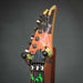 The body of the JEM77 is basswood bolted to a maple neck with a 24-fret rosewood fingerboard with fluorescent green vine inlays. Components include light pink DiMarzio pickups mounted in a clear pickguard with a pair of PAF Pro humbuckers flanking a custom JEM single-coil, a double locking tremolo bridge, pink top hat knobs and Gotoh tuning machines.